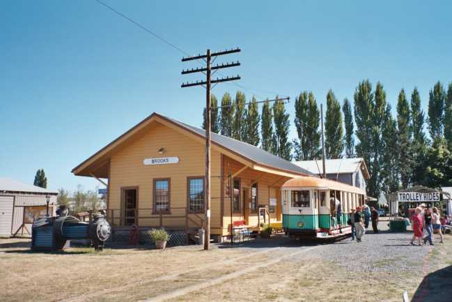 This is the former Southern Pacific Railroad depot at Brooks, Oregon. It was moved about a mile west of the S. P. main line at Brooks, several years ago to Antique Powerland Museum and restored. Antique Powerland Museum is also the home of the Oregon Electric Railway Museum. A long time member named Harvey Hilands, now deceased, asked us, (The Electric Railway Line Dept.) if we could someday put up a 3 cross arm pole that looked like a photo of the depot that he liked. This summer we finished extending the trolley line to the depot and since we had the poles for the trolley wire, we honored his request and this is the result. Everyone is amazed at how much that "telephone pole" adds to the authenticity. For details about the insulators on it, please go to the next shot. |