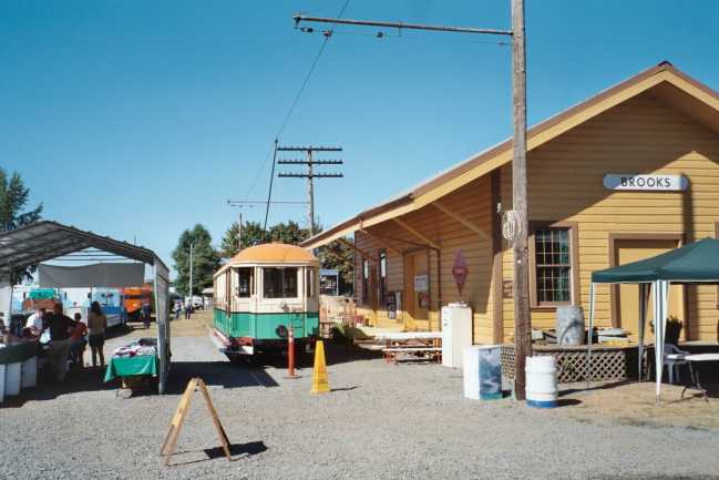 A long shot of the depot facing north. We will have 3 cross arms on the next pole north and possibly the pole closest to the foreground. I have not seen many old photos of depots with trolley wire on the communication poles but there are a few I have found, one was in Iowa. The depot folks would love to have a real train there, but the trolley is as close as they will ever get! I do think a steam locomotive would look great near the depot. Look for a couple of these same photos in the Trains and Railroads album. |