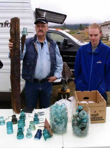 Aidan Morgan (left) proudly displays rare threadless insulators he found along the Collins Line years ago. James Bancroft from England looks on. James may hold the record for the longest distance traveled to an insulator show, ever!