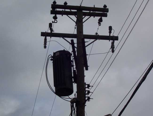 This pole still remains as part of a small (6 span) branch in the Northern Electric Company's system. There are few cross arm mounted transformers left in Flin Flon. All are in Northern Electric's system since Manitoba Hydro did a citywide repacment of all of theirs 3 years ago. Northern Electric is owned by the mine and is only interested in servicing mine buildings. They originally built Flin Flon in 1927, but gave up all the distribution in the city to Manitoba Hydro in 1972 leading to a massive citywide rebuild in 73. This branch is the only one not feeding a mine building and is used to feed a skating rink and some city maintenance buildings. Manitoba Hydro is now taking over this line, and instead of using these old structures (see next two photos), they are choosing to build a new branch off of their system. |