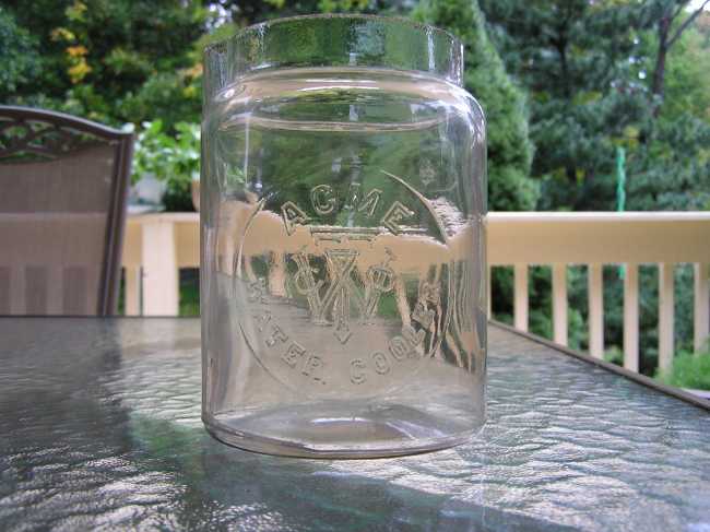 Picked up this battery jar at a bottle club meeting this past Wednesday. I've never seen one like this before, but was quite impressed with the Whitall Tatum logo. The base is also embossed W T & CO..... I'm adding this information after returning from the Keene, NH bottle show. This in fact, is not a battery jar although it is exactly the same size and shape. This particular jar is a liner for what appears to be an early version of a thermos bottle. I have a complete unit now and it all makes sense. I will post another picture if just one person seems interested enough to request it. |