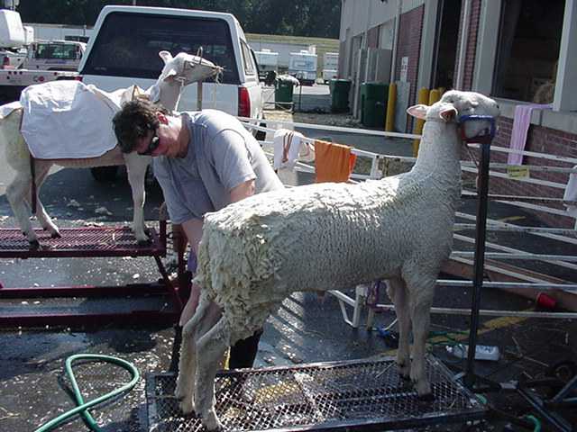Jill washing one of Steve Blair's lambs to get ready for competition at the BIG-E Eastern States Exposition in Springfield, MA