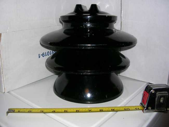 Just obtained this (unlisted in GIFONA) Isorex 3-part glass power insulator at the Keene NH bottle show. Maximum diameter is approx 10 inches, max height is about 9 1/4 inches. Glass is colored "French Wine Bottle" green. Each section is embossed with ISOREX on "front" and 835 on "rear". These are in quotes as the sections do not have the embossing aligned with tach other. The piece is currently not available for sale or trade. There are a couple chips around the rim of the "dome" The cement holding the three sections together is slightly "loose". THis piece has definitely seen "action" for some length of time. I re-measured the dimensions, they are 9 1/8 inches tall, the top disk is 10 1/8 inches, middle disk is 8 7/8 inches and botton (base) diameter is 7 3/4 inches, these are nearly identical to those for an EIV or L'Electroverre CD 379 listed in GIFONA, which was used in France, and also in Syria. [IFONA CD 378.7] |