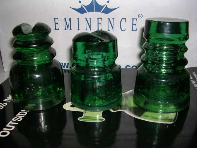 These are three Russian (or perhaps Ukraine) emerald green glass insulators, embossed BC3 // 49, the "flat top" one has the embossing backwards. BC3 are the Cyrillic letters for VSZ, and SZ are the initials for Glass Factory (Stekolniiy Zavod). The two "triple nexk" ones may be of the CD 586 family. Note the little "bulls-eye" on the short one's dome. This may fit into the CD 568.X family. The flat top unit on the far right may be a CD 474. [IFONA CD 586? 568.x? 586.2?] |
