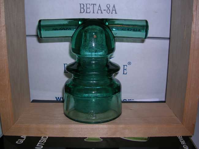 A nice clean CD 690 EIV "T-bar" that was made in France, but came from Cambodia. Note the "A inside a C" embossing. This was purchasedf rom a listing in CJOW last year, the money went to support the Ministry in Cambodia.. For a size reference, the inside width of the wooden "frame" is 7 3/4 inches. Color is somewhat more green than aqua, and is listed in GIFONA as being "green". [IFONA CD 690] |