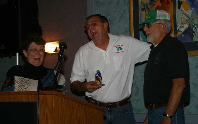 Charlie & Sandra Irons receive the Best of Show trophy from Glenn Drummond (right) at the Saturday evening banquet for their battery rest exhibit [id=135968988]. (Photo by Kevin Jacobson)