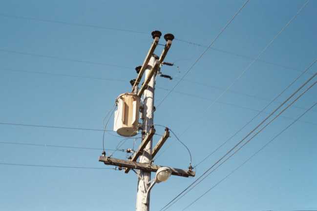 This is photo 1 of a short side street in Orick, Ca. located on the N. California coast. Every pole on this street is old and there are NO sky blue insulators! Orick is the northern most community served in the huge Pacific Gas & Electric Co. service area. Note the large size "grasshopper" fuse cut-outs with "trip-o-link" fuses. The primary voltage is 12,000 in a delta configuration. |