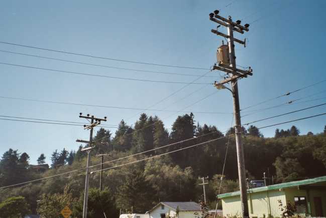 Photo 2 shows the next poles including a single phase tap on another side street. Way in the distance you can see a pole with sky-blue insulators. It is rare to have this many older poles in a row today. The multiparts are mostly M-2751 and are oversized for 12 kv. This is common practice in coastal areas to combat leakage in the salt air and fog. Oddly, PG&E does not use "Fogbowls" in these areas, as other coastal utilities do. |