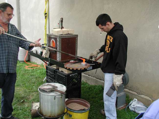 One more shot of the Wilkersons - this one shows the glass that "Papa Fred" has gathered as "Baby Fred" cuts the exact amount he needs to press a cobalt frog. Very interesting process to watch!