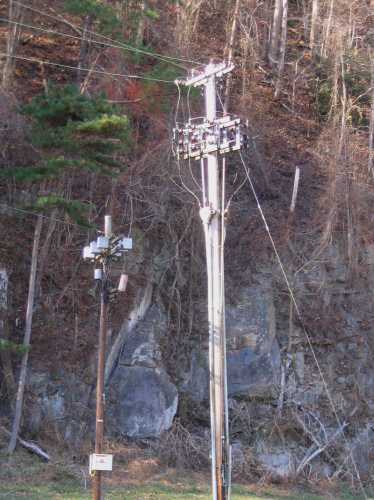 Fontana Dam is also notable in that, breaking from TVA tradition, it has an outgoing 12 kV circuit to feed local customers, including the resort town of Fontana Village. Here the 12 kV circuit comes up from its underground run from the switchyard. There are dual underground circuits for redundancy (the front circuit is closed, the back-side circuit is open). Even though the generator voltage is the same as this circuit, the line is fed from a transformer on the 161 kV bus, to help prevent lightning from running in on the generator leads. |