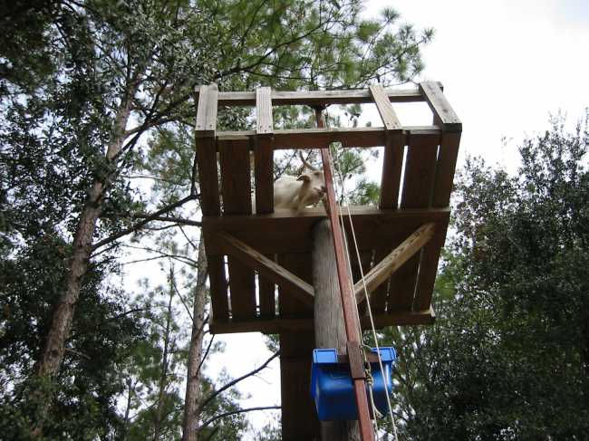 You can raise food up to the goats. This little guy learned to pull on the rope to try and get the food up faster.
