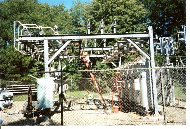 Here's a pic from earlier this summer. the transformer blew at the sub by my grandparents, so the sub had to be rebuilt, and the substation guys let me have the old ones that weren't dammaged. This pic is of one of the substation techs hooking up the double throw switch. |