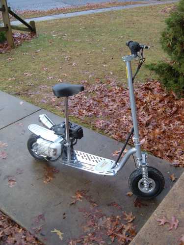 My birthday was this past week and look what I got! A gas powered scooter! This scooter has 10-inch tires, a 49cc two-cycle gas engine, and disc brakes. The scooter is also very efficient too. It gets over 30 miles per liter of gas. (the tank holds one liter of gas). It also has a top speed of 30-35 miles per hour. |