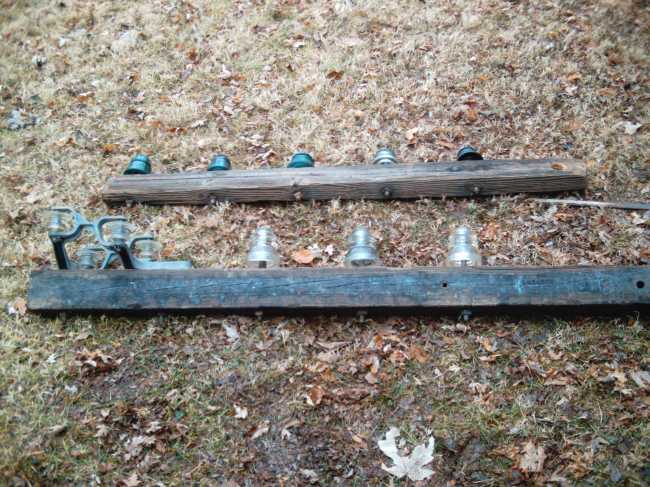 Here is 2 of the 6 partial crossmembers recovered from my grayson county hunt back in 2004. I do have several other whole crossarms that are being used on other display poles that I'm putting up. The insulators on this arm are in full entirety with no chips or cracks in them. I plan to find more on some of my future hunts. |