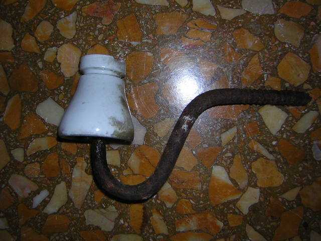 This insulator, very similar to the "crazy insulator", but a bit larger, dates late 1880. With its original hook for wooden poles