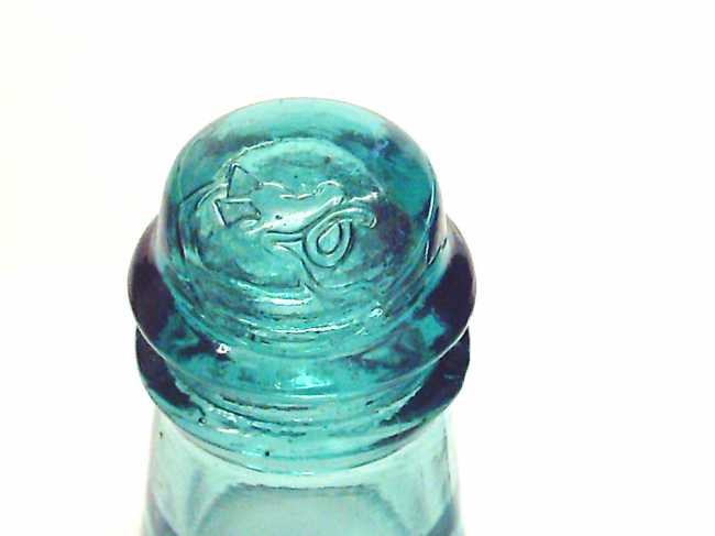 Here is a very cool look at some straw lines and a couple of shards of glass that created this very interestingly unique Dragon Shaped figure on the dome of a Hemingray Toll. I would like to hear from some of you collectors about this unique one of a kind events. This is a CD 121 HEMINGRAY No 16 with SDP with the run of the mill light blue aqua color. But the straw lines set this insulator apart from any other and is the only one of its kind. The straw lines have formed what appears to be a mythical Dragon or Sea Serpent with a pair of eyes and a flailing tongue. Also take notice to the ears, they are shards of glass from a previous pour or cullet. The ears have very sharp edges to prove that they are shards of glass. This Hemingray has been dubbed the Dragon Dome because of the vivid appearance. This is a real treasure to behold. |