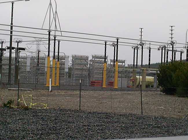 here you can see some banks of capacitors behing these huge bus bars. check out the line posts supporting them! they run over to some sort of monitoring device?