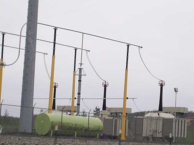 here are the 'monitoring devices'? see the wire leaving each transformer? and connecting to the signle bus line? I assume the green tank has some oil or fire supression foam in case of a transformer / breaker fire.