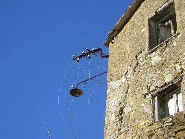 In Canate village, abandoned in the 1960s and teathre of a battle against Nazis in the 1940s, what remains of the lines on the walls. All insulators are cemented in their own pin