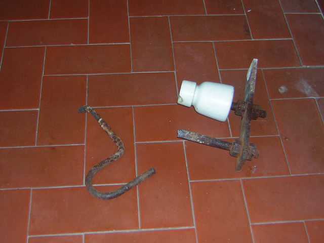 Here a wall crossarm with a cylinderhead insulator, and a wall hook: all I could take in the abandoned village of Canate