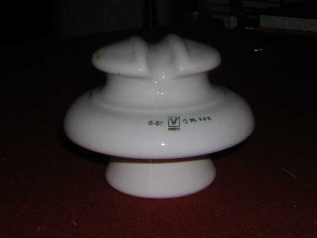 This standard 3 kV insulator (it's a 2 shells Weitschirm) was designed in the 1920s and known also as FIL and RICHARD GINORI, has ben manufactured in Genoa town in 1952, June. It's 95 mm tall with a max. dia of 130 mm.