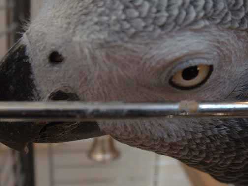 Chester, our 15 year old Congo African Grey parrot, has as much inquisitiveness as he does attitude. Here he is in extreme close-up. I think he's looking for Lee Brewer ;-)...