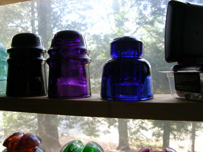 Dark olive amber (blackglass) McLaughlin, CD 121, a Purple WGM 121, and a Cobalt blue "Neman" from Belarus. Very faint, upside down shoulder embossing looks like "HEMAH" CD unknown to me. The black thing to the far right is an XM Radio antenna, in the only "sweet spot" I have for good reception with the antenna located indoors. Just below, the tops of a couple of amber Mexican Telegrafos Nacionales and one 7-up green Hemingray CD 214 can be seen. |