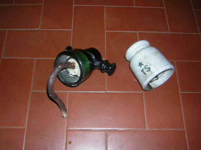 Today I got these two insulators on the way to Piacenza: one is a telephone FT 92 by RICHARD GINORI marked with the star and the "TS" logo (State Telephones - Telefoni dello Stato) and dates sept. 1960 (my birth's date!), the other one is a green glass T-bar embossed MIVA BT 3. |