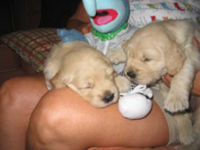 This is two of the seven little guys born about two months ago. They are Golden Retrievers through and through. These are a maile and female doing what they do most at this age, sleep. They are so cute. Belong to a friend who lives near me. Can't you just smell the little guys? |