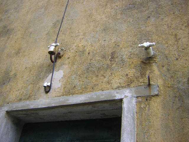 Some old insulators on this wall in Torriglia village, 25 miles from Genoa: t-bars, nosers, and dark green glass (see also the other pic).