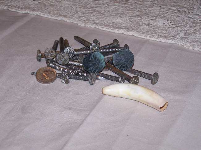 Here is a small selection of date nails my sons and I have found over the last month or so. We went out yesterday and got about 30-40 more all off of one old train trestle. Those are still soaking in vinegar. The two larger nails were found on todays insulator hunt. I was very surprised and pleased to find the NLC 28 (Ntn'l Lumber Co. 1928) nails. I will leave them as is because they are copper and have a nice patina to them. Now the surprise...notice the large white tooth? That is one of several alligator teeth I found beside the track on a hunt over the winter. A partial skeleton was there including a partial jaw bone. It is estimated this gator was over 10' long. I also found a metal tag mixed in with the bones and traced it back to the farm the gator was released from. Just thought you guys would get a kick out of the tooth. The nickel was placed there for size comparison. |