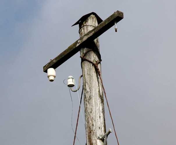 What's wrong with this picture!! Another lonely pole with a funny look along a disused railway. On this stretch, all the poles had only one crossarm, or sometimes only hooks, indicating it was just a branch line. This poor insulator lives a tough life, sitting upside down with water pouring into its skirts! The brackets holding the crossarm are simply gone. Lucky for him, it rarely gets below zero here, which would undoubtely cause him to split. |
