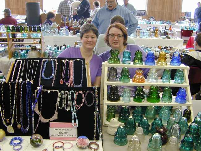 Jill showing off her jewelry (Yes, I did have insulators on the left side of the table), and Ginny Way with a nice assortment of colored glass. She also had more insulators to the right on her table.