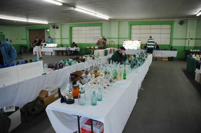 Note Bob's Hemingray lamps, jars, and other go-withs in the foreground. Bob is holding his cell phone. The tables to the left are the back side of Colin Yennie's tables. You can see the large grouping of purple insulators, shown in more detail later. |