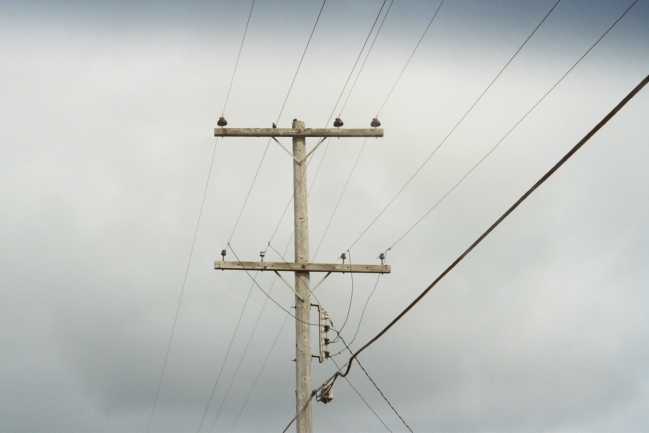 Here is an older Grays Harbor P.U.D. power pole using a blue insulator to mark the secondary voltage neutral or grounded wire. In some states it is code required to mark the neutral with a white or blue insulator. This utility uses white as you can see on the spool rack but sometimes blue is also used. The little thing on the top crossarm is not an insulator....it's a bird, posing for the shot! The pole is on a road in the middle of a cranberry bog. |