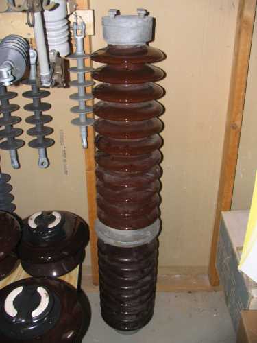 Here is a two part station post made by GOULD BROWN-BOVERI. The combined voltage rating is 115kV. The top section is dated 1981 and the bottom section is dated from 1979.