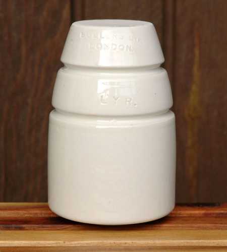 This type of insulator was exclusively used by the Lancashire & Yorkshire Railway, and veteran collector Keith Neal never observed this pattern in use. Recently some of them surfaced on eBay, and I was lucky to win this one. Quite an odd shape with the wire grooves being quite narrow, indicating LYR did not use the thick galvanized iron wire. The two grooves indicates it was used for transposition and/or terminating of the wires. It is stamped "Bullers Ltd London" and between the grooves "LYR". Probably dates circa 1895. A nice addition to the collection!! |