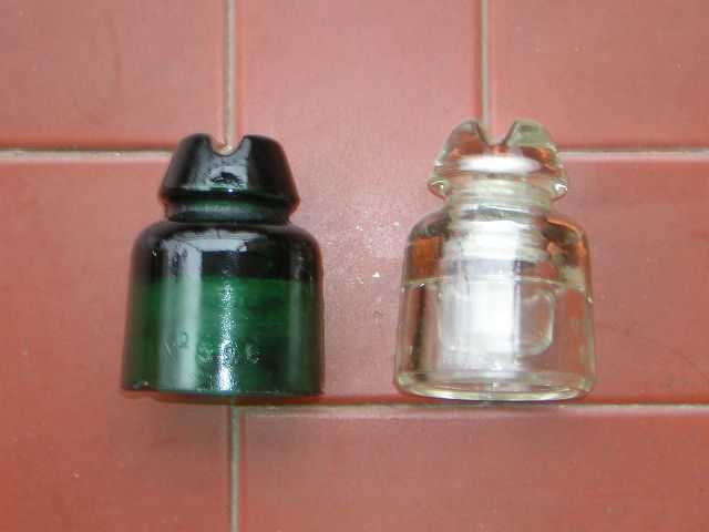 This pic shows one of the earliest versions of the type N°396 mfd by BORGO in the 1920s (green glass), and the same type mfd by MIVA in the late 1950s (clear glass). We can say this insulator has been very lucky to survive so long, considering that it's an unusual size. |