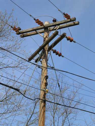 This little pole has it all, spools, deadends, cable ears. That white spool looks more like plastic than porcelain.