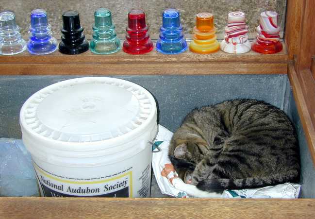 This is inside our planter (which has never been finished). Hemi (the cat ;-) is sleeping on a half full bag of potting soil. You are looking east, and thus to the right is south. This place where he is sleeping gets a lot of sun in the morning, and he likes the warmth. Behind is the window sill where you can see some of our NIA commemoratives. The bird seed bucket is Hemi's "throne" -- He sits on that at dawn for hours watching for anything down below... If you look in the lower left, you will see a moderate (30 lb) chunk of opalescent glass from the Hemi dump. So, there is a lot of insulators and go-withs in this picture! |