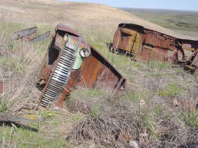 Looking back down the draw past an overturned DeSoto, one can get an idea of the miles and miles of nothing out here in the Scablands. Where people care not to go, neat things can be found around any bend.