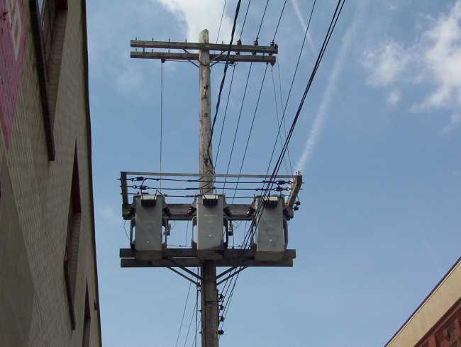 This is not too old of a pole but defiently does fit in with this group. Also the first pole pictured in the next picture of this street. Notice the 3 Dominion 614's sitting useless on the top right side of the structure just above the transformers