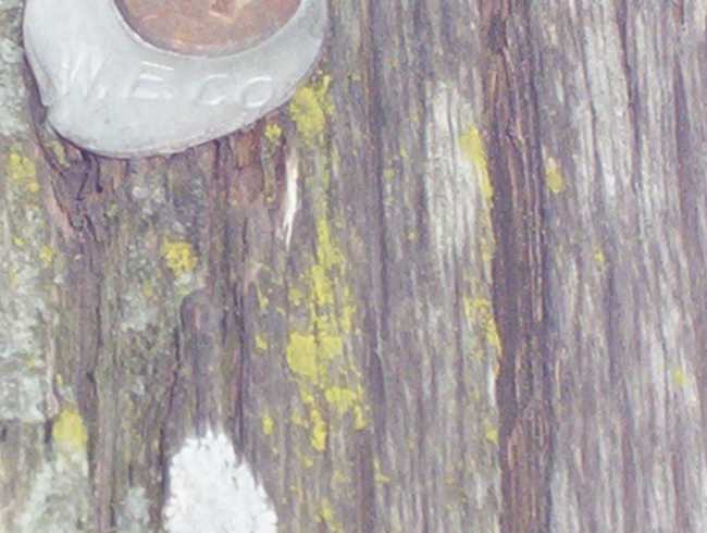 This is the first of a small set of pictures I took of the former Winnipeg Electric Company lines which had been suffering from many years of neglect and had somwhat fallen into disrepair. The whole system had been taken over by Manitoba Hydro about 5 years ago. Since then; there has been a massive citywide upgrade taking place although much of the older distribution is still very prominent on Wpg streets. Stil lots of glass up on these lines. This is a picture of a 1929 date nail holding a WEPC tag to one of the poles that will be shown in the following pictures. |