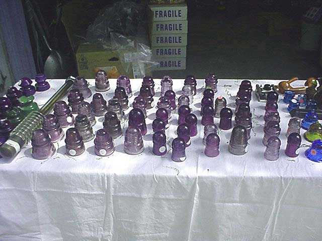Almost everyone had a purple insulator. Here is almost a whole table devoted to purples. There were many different styles and makes from lilac H.G.Co signals to California Rosies.