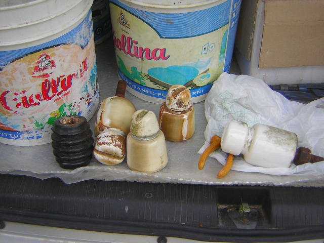 The first insulators we got, from the wall of an old substation: including an extremely rare indoor insulator in dark green glass type MIVA RILLER N°2