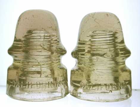 About 2 years ago I came across a soot covered California in a box of very blackened insulators in an antique store. The owner told me they had come to him via an old lineman from Spokane. There were two dripped Star 164's in the box, leading me to think this lot may have originated out of Snohomish County where those were found. Well, the California had an odd orange-ish color, even through the soot, and when cleaned turned out to the one shown here on the left. A strong peachy pink and yellow mix. Saturday my brother brought this one on the right for me to look at. He got it from a lineman who worked for the Hecla Mining Co. up in the Silver Valley. This fellow told him all his insulators came off installations he worked on up there in that area. Purple 161 California's were still on poles all over the area east of Seattle when I was growing up, but I have never heard of them being found around Spokane. The Peachy color is rare in California's, and leaves me wondering if this first one I found didn't come from up there in the Silver Valley as well. Either way, they look real good together. One is way more orange with a band of yellow across the skirt, while the other has a strong orange dome with a more yellow-straw body. Some of these California colors are simply stunning. |