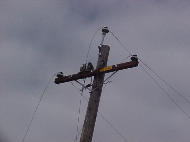 The # 4 hard drawn solid copper line wire still tied in, but not for long... A new 715 mcm Al conductor will replace it.