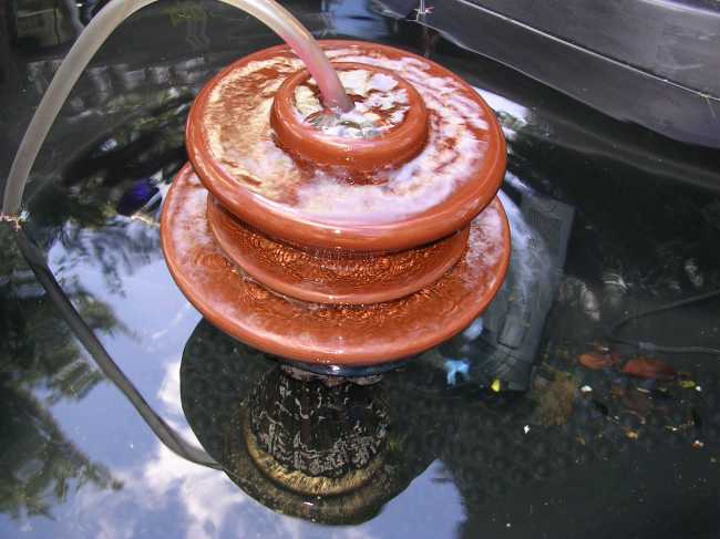 An old fairly common multi-parter, standing on its head, serving as a fountain in a small decorative garden pool. I didn't bother drilling through all that porcelain, just cheated with some clear plastic tubing.