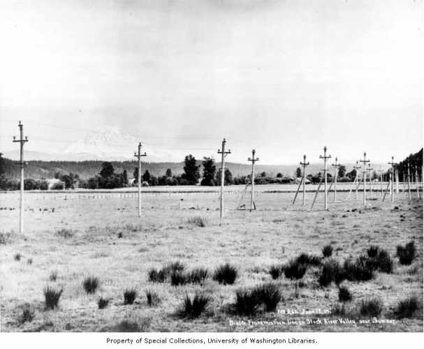 Old photograph of a Double line heading towards Sumner from Electron via Orting June 13, 1904. Nowadays there are modern lines is almost the same place. Both are 115kv but one is idle right now. The other is labeled WR - O, Which I think is White River - Olympia because I picked up the same line along Graveley Lake Drive, south of Tacoma and it was heading south through Lakewood, Stilecoom, and past Ft. Lewis. |