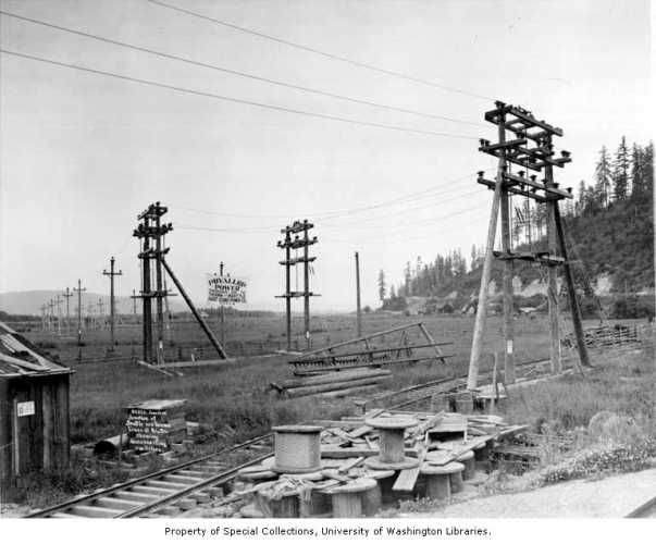 Old photograph of Junction of Seattle - Tacoma transmission lines June 13,1904. Not sure where this is in relation to modern day landmarks. There is a present day line that follows the Union Pacific tracks from Sumner to Tacoma. It is ID'ed as TJ (Tacoma Junction?). It is no longer in use since PSE does not serve tacoma any more, not since the 40's I believe. What gets me wondering is that the line is insulated to 115kv for a while then abruptly goes back to 55kv construction. There are a few poles that still have multis on them. It ends at a defunct sub near 84th and Yakima in South Tacoma. |